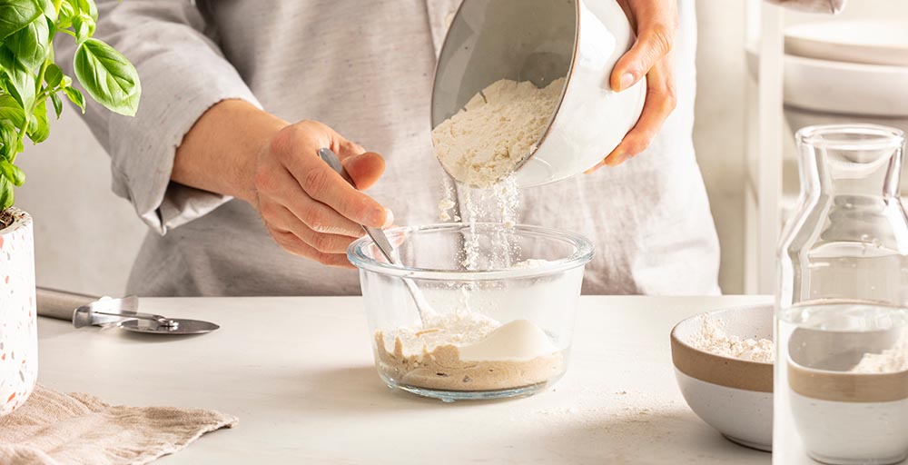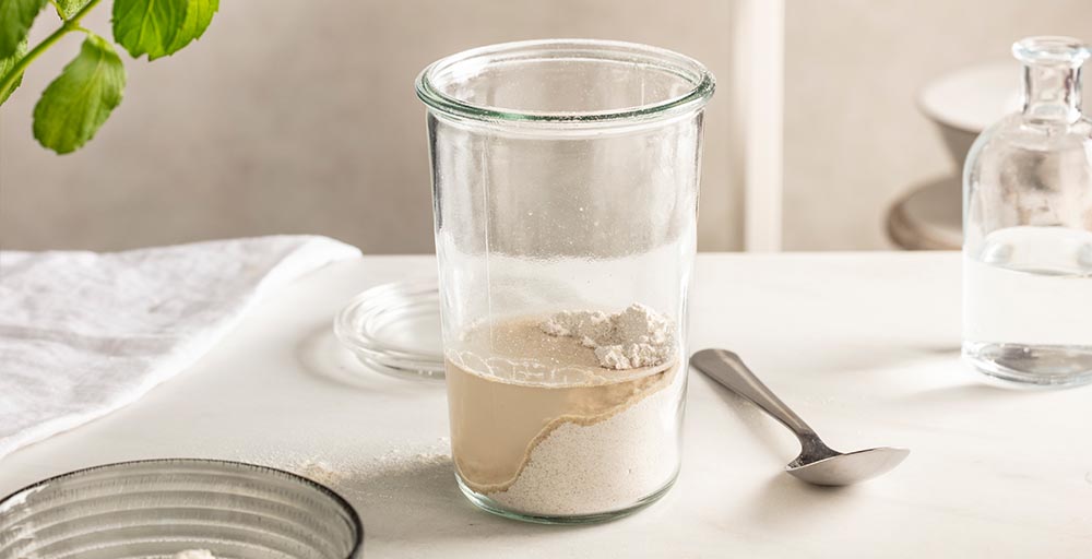 Pomiješajte sastojke: pomiješajte 100 grama brašna sa 100 grama vode (sobne temperature) u staklenci. Miješajte dok se potpuno ne sjedini i dobijete gustu smjesu poput one za palačinke.